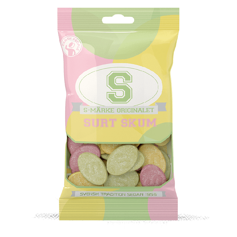 S-marks have been on the Swedish market since 1956. S-marks sour foam is a sour foam candy with a taste of pear, pineapple, raspberry and lemon. The foam is wonderfully soft with a slightly crispy surface and covered all around with a layer of sour sugar and also slightly chewy. The color of the foam is light pink, light green and light yellow. This candy is a favorite among many Swedish candy eaters who love foam candy with a lovely sourness and a fruity taste. Candy People, which produces these s-candy in different flavors and shapes, has been operating since 1982 when its founder Joanis Masudi Youssef bought a candy store in Möllevången in Malmo, Sweden, in 2004 his son Jacob Youssef took over as CEO and today the company is led by Jacob's sister Anna Bebinno Youssef, a true family business for generations. The products are free from palm oil.